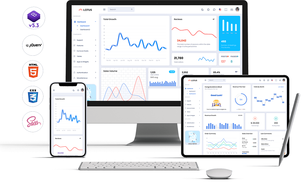 All layouts of Lotus Admin will look great on any device. Lotus Admin template is fully responsive with Bootstrap Framework